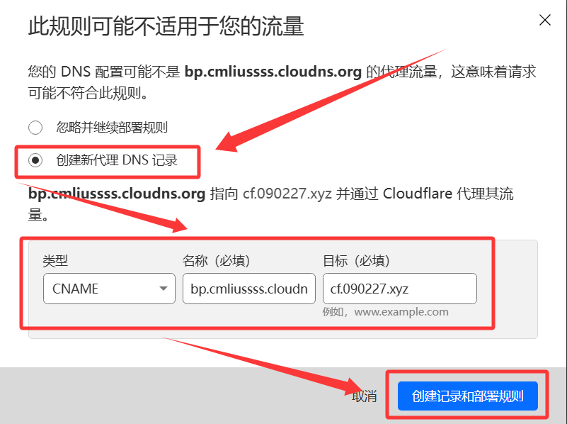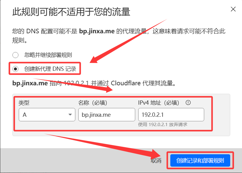此规则可能不适用于您的流量,选择创建新代理 DNS 记录,选择以下任意一种方式:- 类型